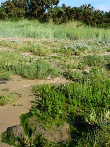 The question is: which is better with dressed crab - this or asparagus? Perhaps this, as every time the dogs get into the veggie patch, they chomp the asparagus tips. The samphire on the foreshore - we walked out there this evening - got left alone.