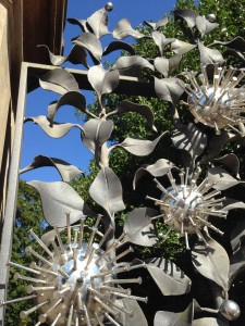 The gates to the estate gleam - a clever construction of metal sunflowers. From sturdy sockets sprout nails as petals. Footpaths meander through a wood and we followed a trail past trees with Jews ear fungus and thickets of brambles. Round a corner Cells of Life by Charles Jencks comes into view. The remit of this sculpture park is to educate and to promote artists who choose where to put their commission and respond to the site by creating what suits. Cells of Life is a crowd pleaser with coils of raised earth swirling up into tumuli and lapped by basking ponds of still water. The installation made me uneasy. For a long time I have had designs on Jenck’s Garden of Cosmic Speculation but it is only open for one day per annum. Instead I have visited the lesser coiling mound garden at Scotland’s National Gallery of Modern Art. No doubt the Cosmic Speculation one is vast and therefore awe inspiring. These other two leave me wondering about the exacting maintenance implications and whisper a thought that Jencks has had a good idea and is exporting it as a branded product. The mounds at Jupiter seem to fight with the view of the Pentland Hills and it is depressing too to see the heap of spoil dumped unceremoniously beyond the carpark. As for H&S, the lifesaver is mounted neatly at a distance which will not save anyone.